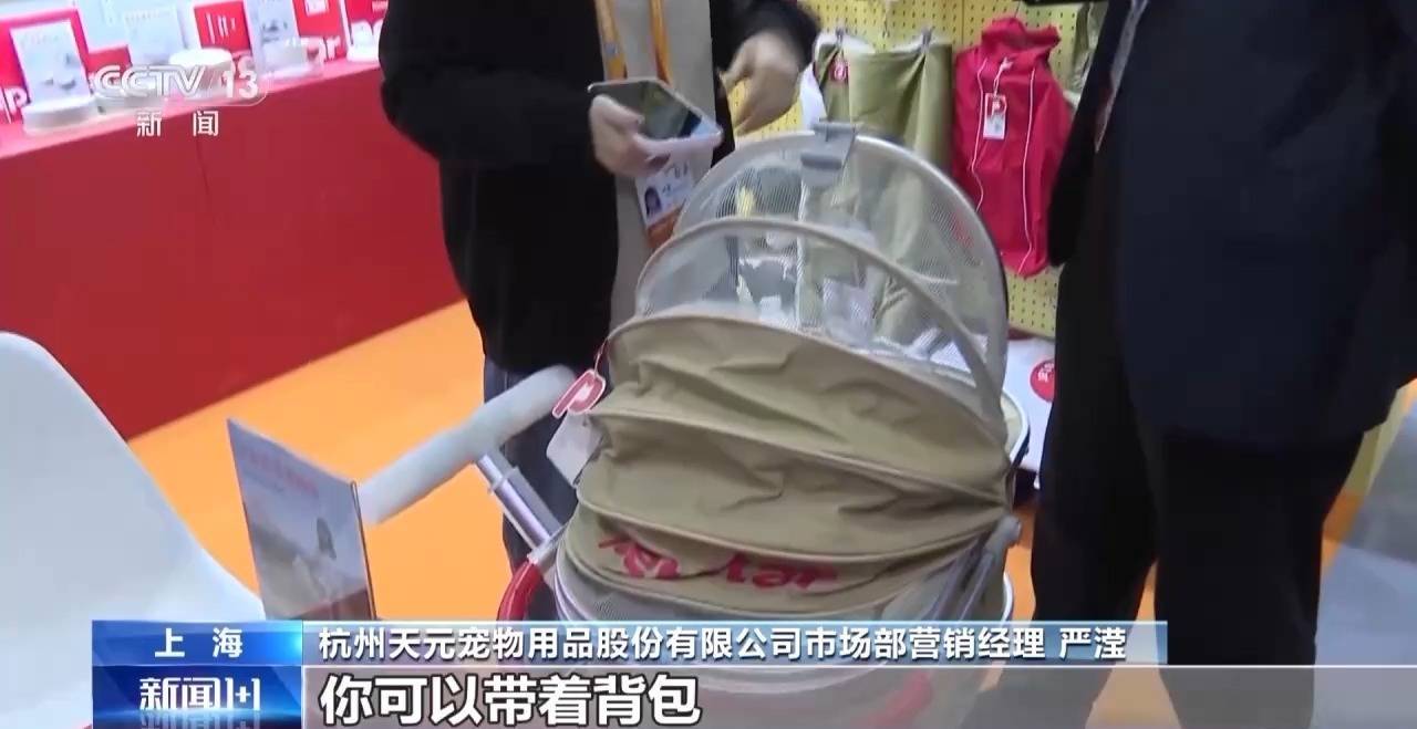 rrrrr杭州天元宠物用品股份有限公司市场部营销经理 严滢:目前来说,养宠的话已经不像以前单纯只是说给宠物吃饱喝足就够了,现在更多是把宠物带入到人的生活,以家庭成员的身份去对待。所以我们也是契合了这次萌爪航站楼的主题,给宠物准备出行前、出行中、出行后的物品,带宠物一起游玩。比如会有一个推车呈现在这个地方,就是说宠物你可以推着它出去,然后更小的宠物你可以带着背包背它出去。