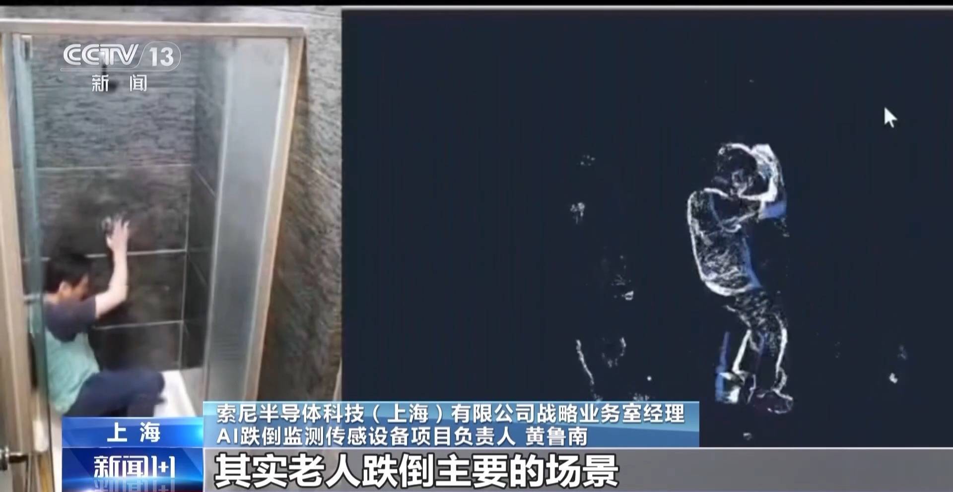 rrrrr索尼半导体科技(上海)有限公司AI跌倒监测传感设备项目负责人 黄鲁南:我们主要是要保护老人的隐私,因为现在人对隐私也越来越重视,我们这个相机只提取人的轮廓。其实老人跌倒的主要场景,更多的是在洗手间或者浴室容易打滑的地方,而且这样的场景他们一般穿的衣服会比较少,所以我们在这样的场景下,用比较模糊的影像就可以精确监测到他有没有跌倒,同时保护了他的隐私。