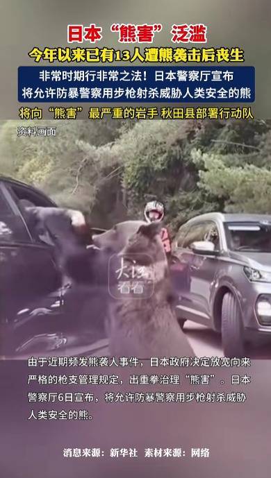 11月7日,据央视新闻消息,当地时间6日,日本警察厅宣布,决定放宽向来严格的枪支管理规定,出重拳治理“熊害”,允许防暴警察用步枪射杀威胁人类安全的熊。新规于13日(下周四)开始生效。4月1日至11月5日,日本已有13人遭熊袭击后丧生。日本媒体此前报道,各地普通警察配备的手枪杀伤力不足,对付熊的作用不大。